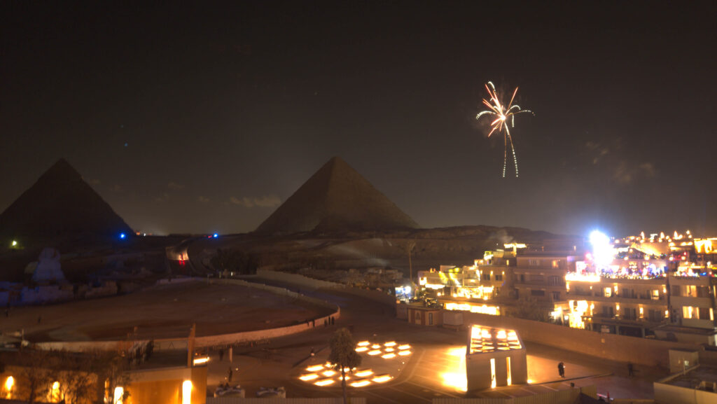 スフィンクス前にはライブ開催、付近のホテルではカウントダウンもされており、花火と音楽が凄まじいです。